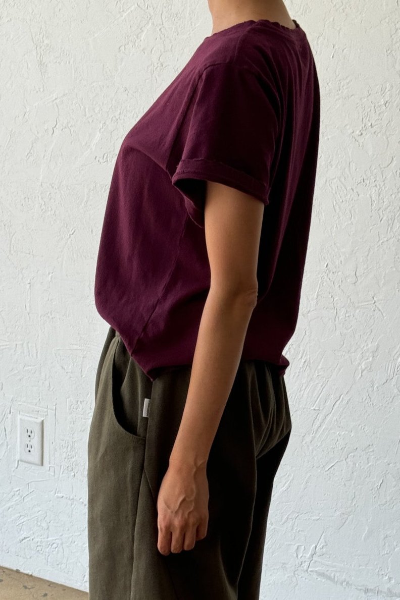 Meet the Darling Tee — It strikes the ideal balance between The Little Boy Tee’s fit and the Vintage Boy Tee’s worn-in charm. Featuring a relaxed boxy silhouette that hits the perfect waist length, it offers gently distressed details and a 90’s fade for a true vintage allure. Crafted from locally sourced cotton, this low gauge knit tee combines a light, airy feel with a beautifully structured yet soft touch, giving you the vintage feel you long for.