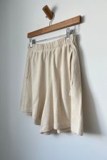 Large: Waist 14” relaxed, Hip 24″, Inseam 5”, Leg Opening 13 1/2″, Rise 11 1/2″