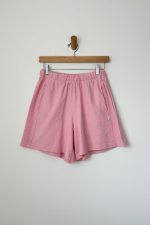 Large: Waist 14” relaxed, Hip 24″, Inseam 5”, Leg Opening 13 1/2″, Rise 11 1/2″