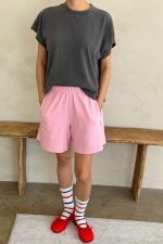 Dream shorts inspired by retro basketball shorts — Crafted from a heavy weight cotton knit, the Flared Basketball Shorts feature an elasticated, high waist with an A-line shape. They’re full coverage, yet flattering and designed with a slightly shorter outseam and perfect mid thigh length.