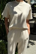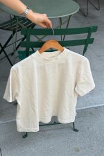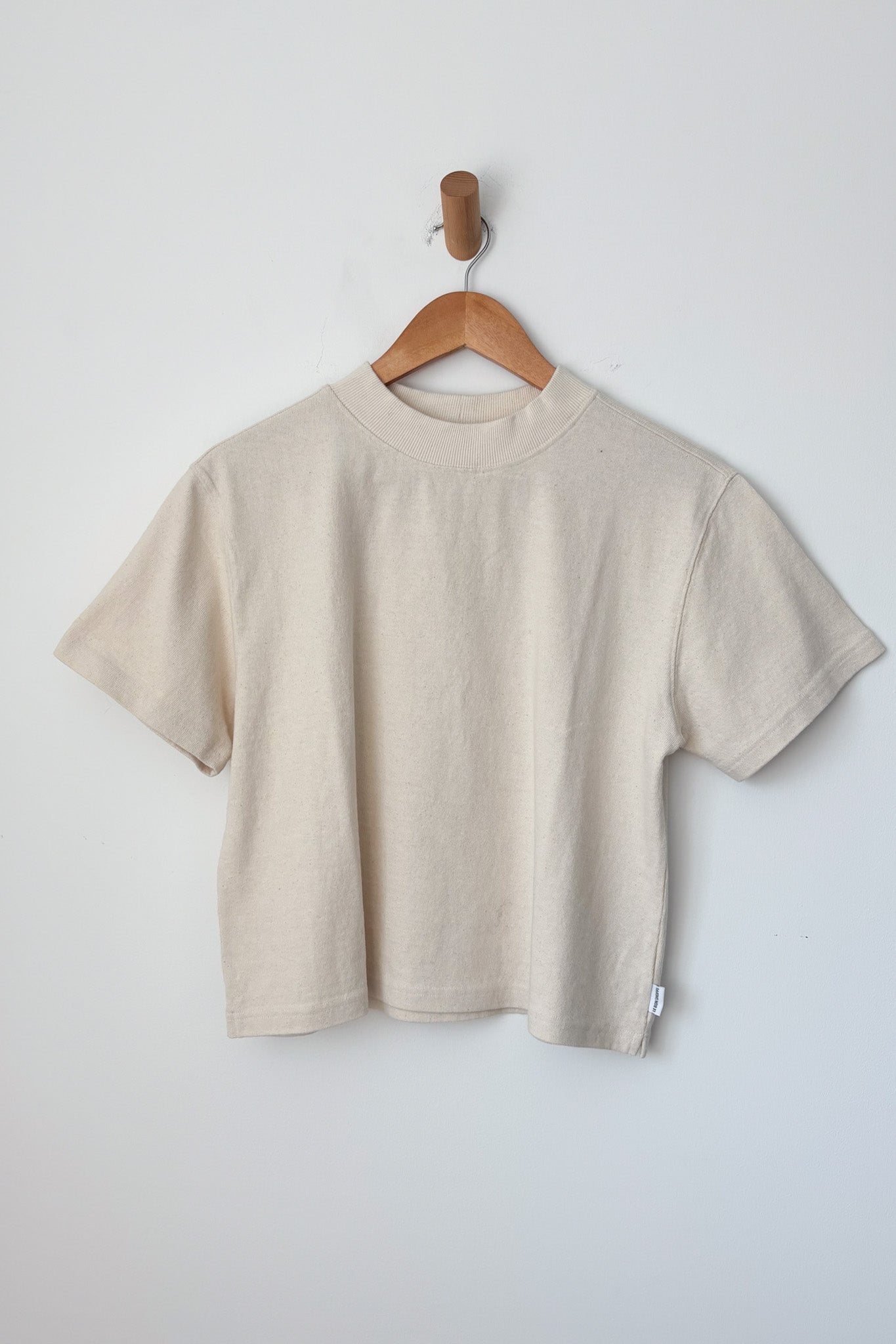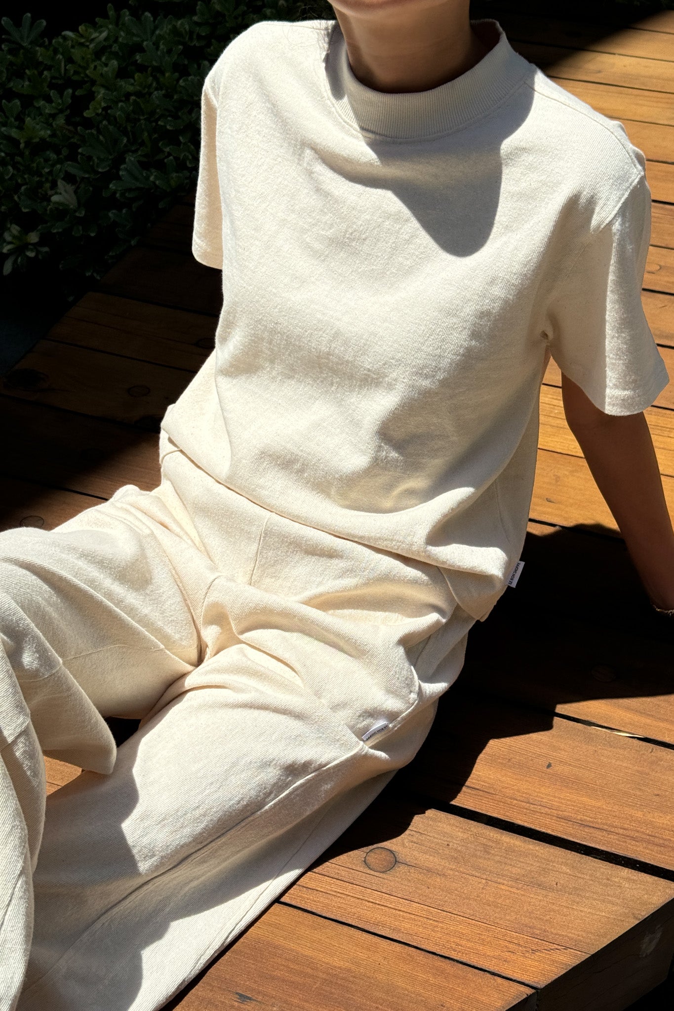 A fresh take on the mock neck tee — The Sunset Tee draws inspiration from the Jeanne Tee, offering a similar boxy fit with an ideal waist length. This tee is elevated by its mock neck and classic length sleeves, combining masculine details with a feminine silhouette for a versatile piece that’s effortlessly stylish and perfect for year-round wear.